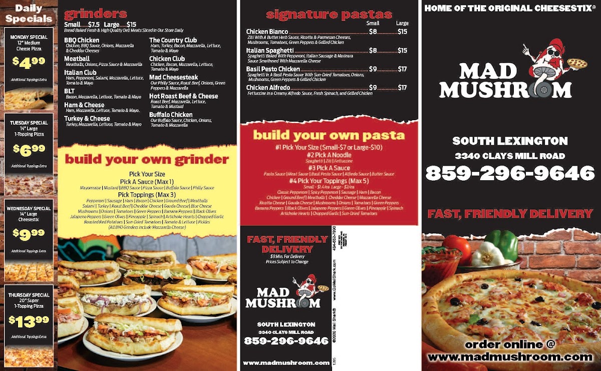 Welcome to Mad Mushroom, where exceptional taste meets creativity on every plate. Located in Lexington, KY, this beloved eatery specializes in pizza, salads, and grinders that cater to all cravings. The star of the menu is undoubtedly the Premium Pizzas, featuring innovative options like the Kentucky Hot Brown and Philly Cheesesteak Pizza, that redefine traditional flavors with each bite.